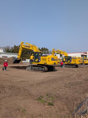 また、センター内のデモヤード及び工場内にて、ICT建機(マシンコントロール油圧ショベル)への試乗、 ドローンシミュレーター、 モバイル端末を用いた3次元測量の体験実習を行いました。