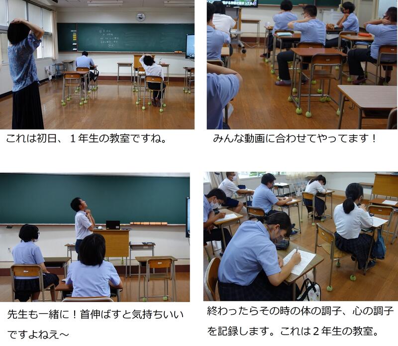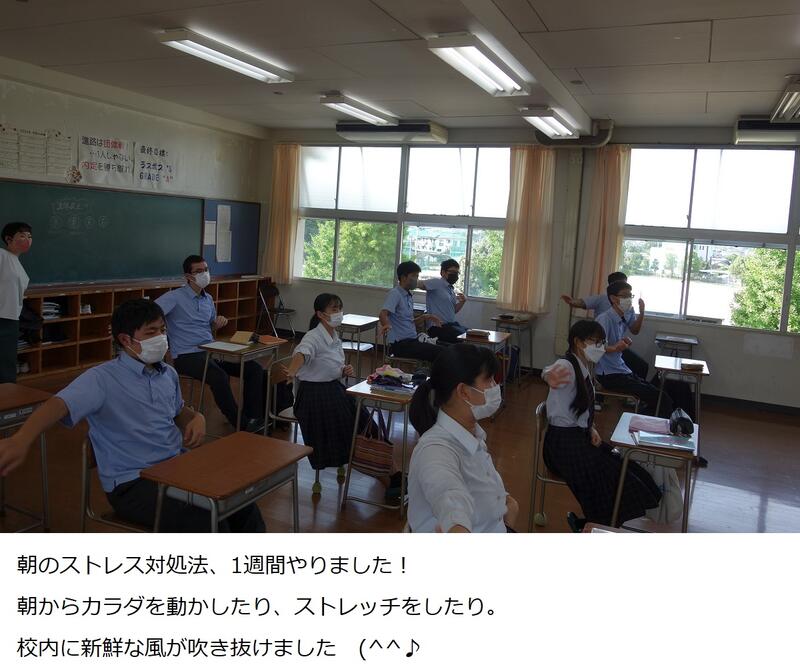 普段は、朝の読書の時間ですが、それを1週間だけ特別に使わせていただいて実施しました。読書も頭がスッキリ、ストレス解消の効果もきっとありますが、この週はカラダを動かしたり伸ばしたりによるストレス解消ですね。