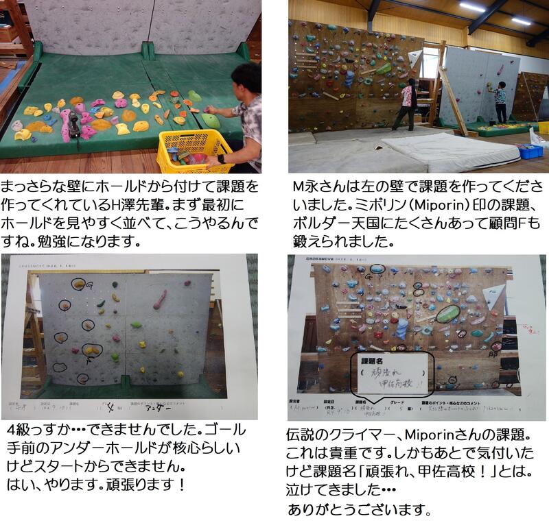 「少年G、アゲイン!」とは変なタイトルですが、7月27日、前回の記事のクライミング少年男子の選手GFが甲佐高校に課題を作りに来てくれました。