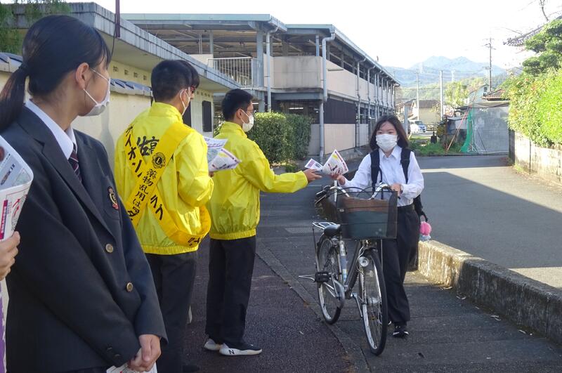 10月6日(金)登校時に、甲佐ライオンズクラブと警察の方と一緒に、「薬物乱用防止」の呼びかけとチラシ配りを行いました。生徒や先生方を呼び止めては、「おはようございます。見てください。」とチラシを渡していきました。薬物を使うことの危険性が伝わって、被害にあう人がいなくなってほしいと思います。甲佐中学校でも中学生が行ったそうです。先日のレモネード募金活動に続き、同じ取り組みができることをうれしく感じました。