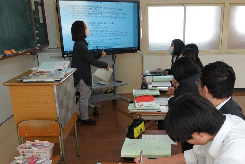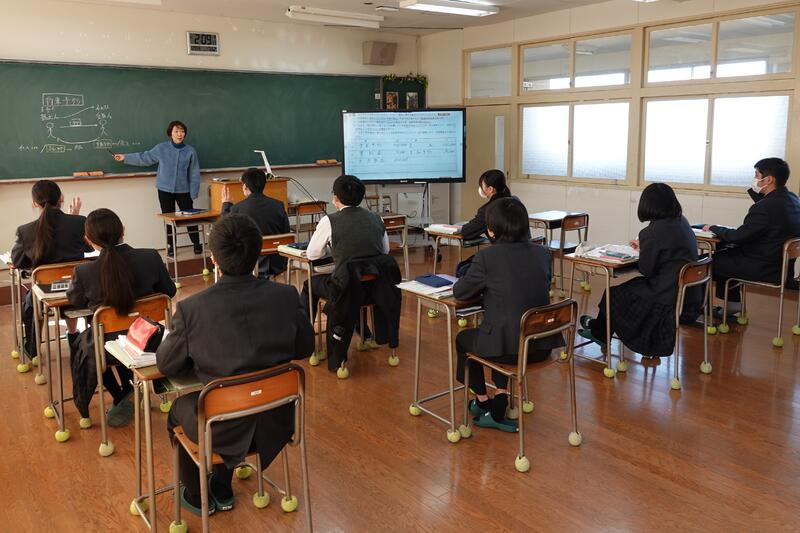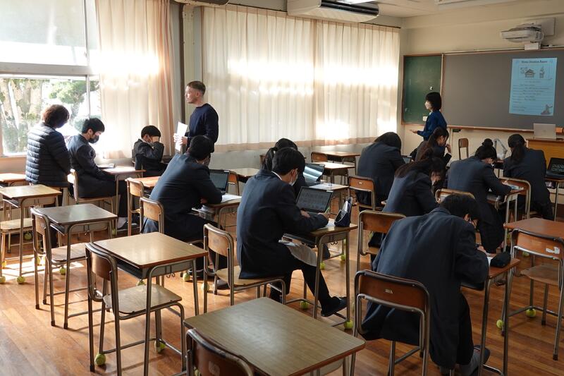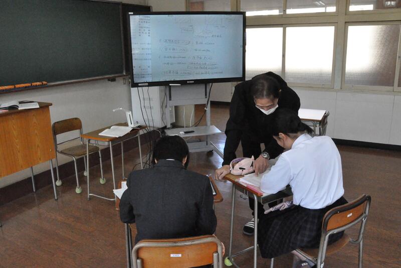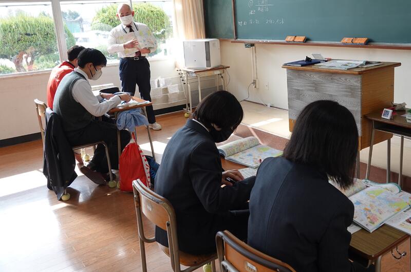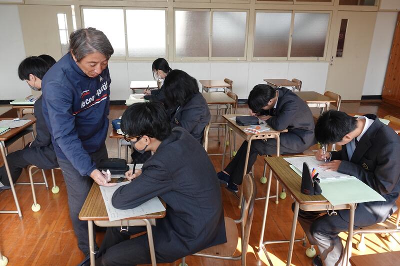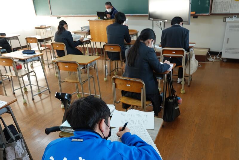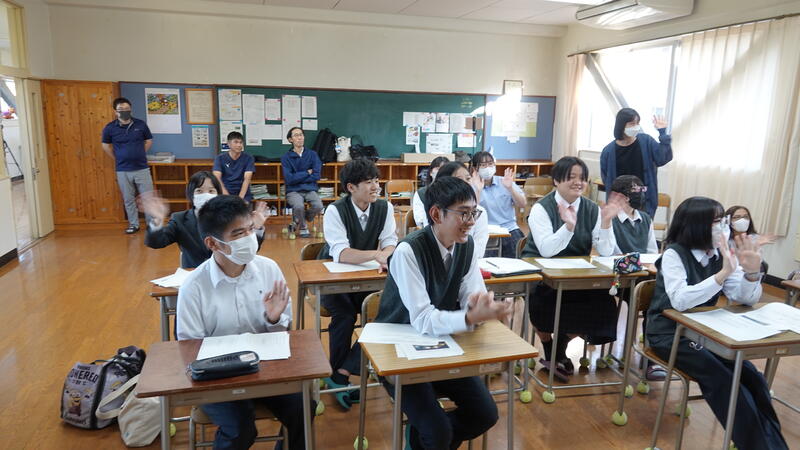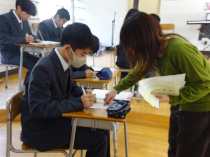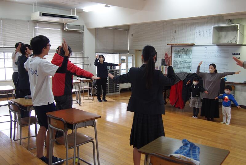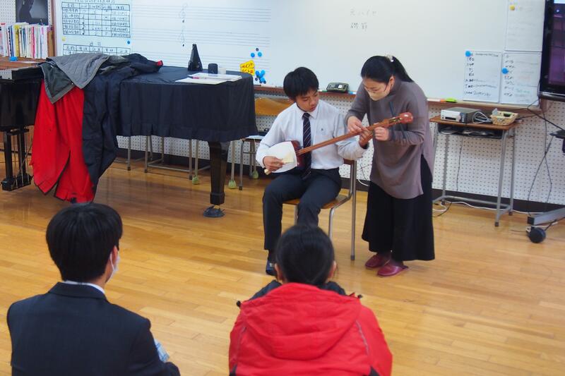 3年1組の音楽の授業にて、牛深ハイヤについての授業を行いました。普段は教員と生徒1対1の授業なのですが、他の3年生や先生方もたくさん来てくれ、にぎやかな雰囲気で講習を受けました。
