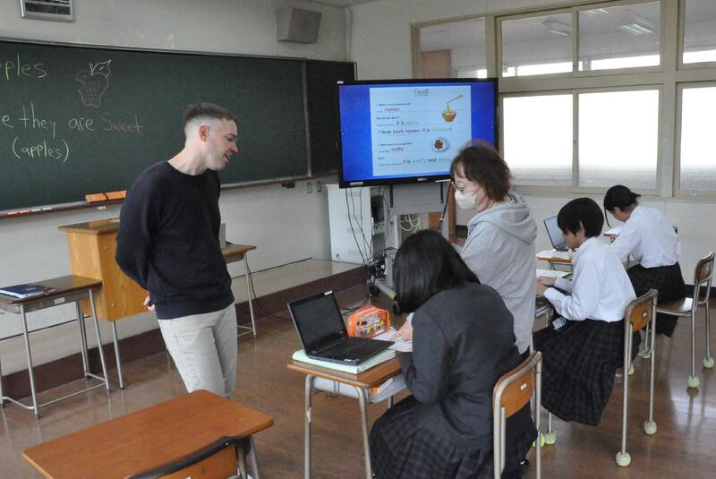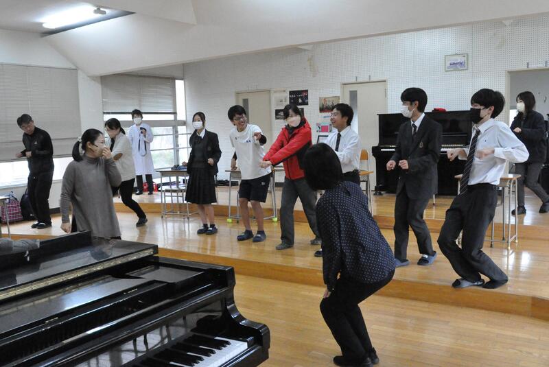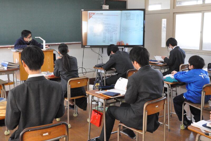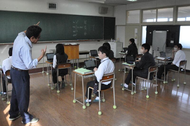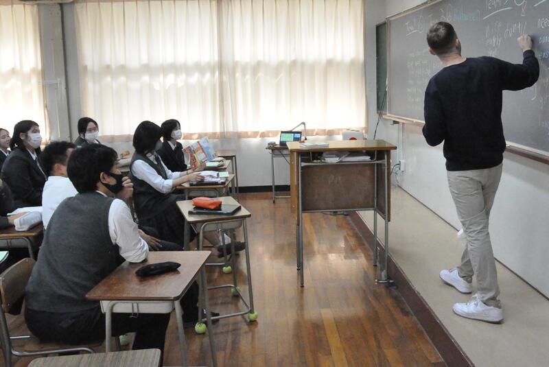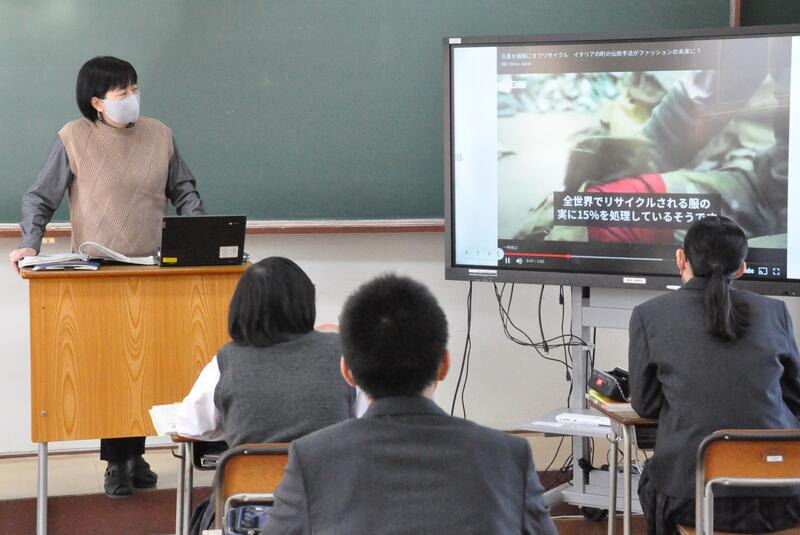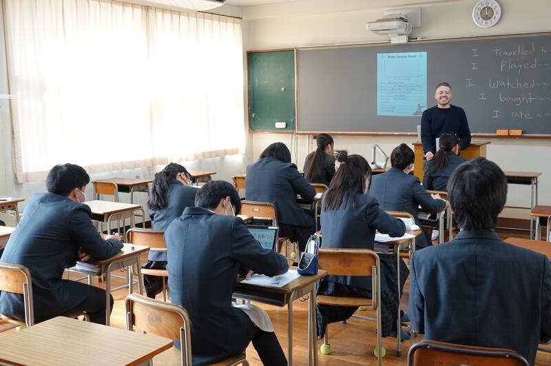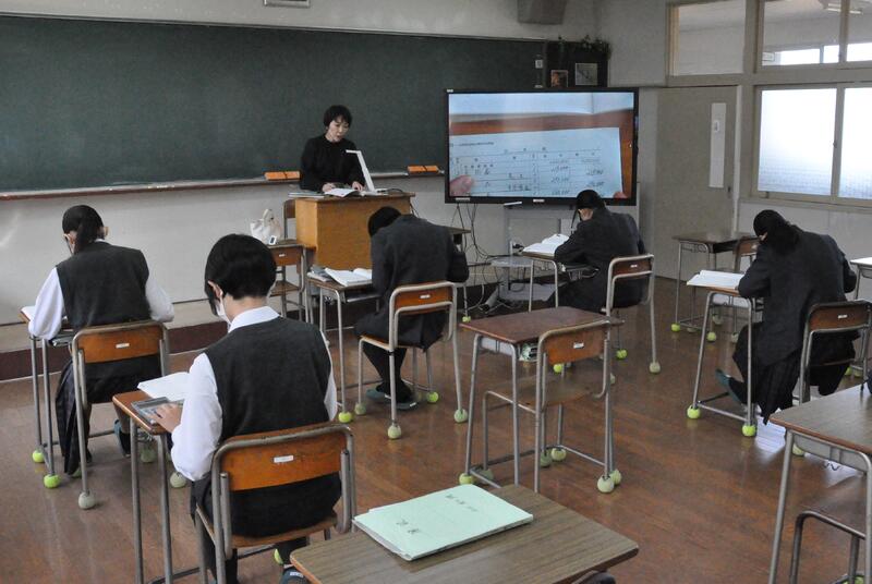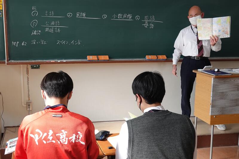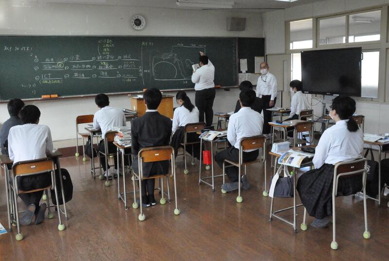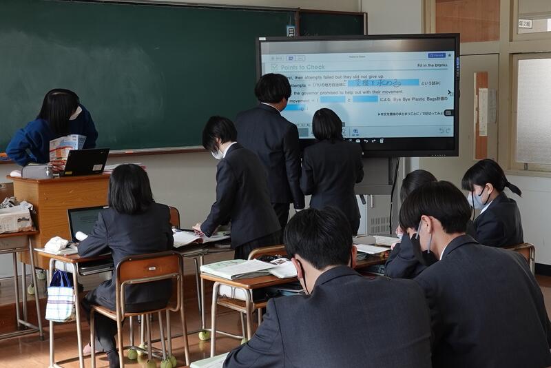 3年1組の音楽の授業にて、牛深ハイヤについての授業を行いました。普段は教員と生徒1対1の授業なのですが、他の3年生や先生方もたくさん来てくれ、にぎやかな雰囲気で講習を受けました。