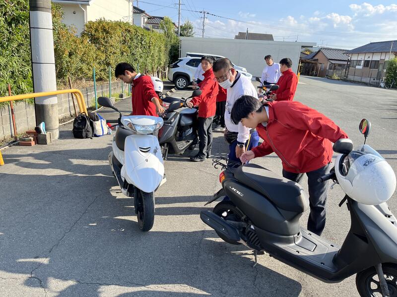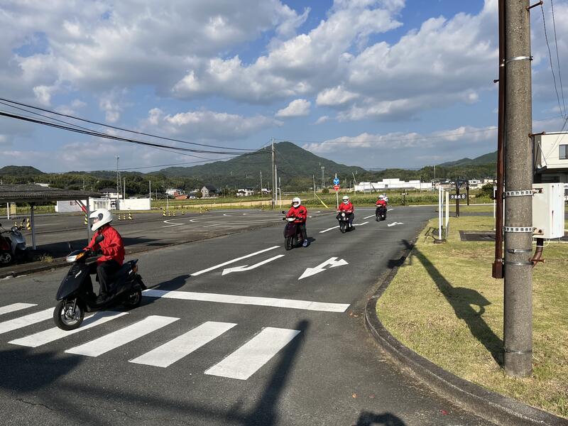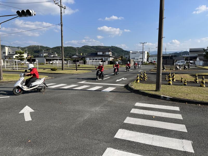 熊本バス自動車学校の協力のもと、交通安全講習会(原付)が実施され本校性6人が参加しました。初めに道路交通法規の講習をしていただきました。実技講習では、講習所のコースを教官の先導で3周走行し、速度や停車位置の確認など親切丁寧に御指導していただき、生徒たちも真剣に講習を受けていました。