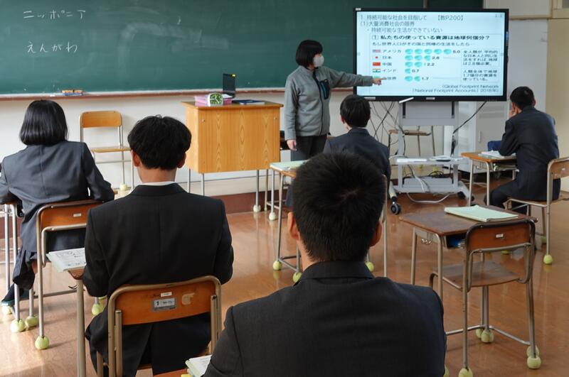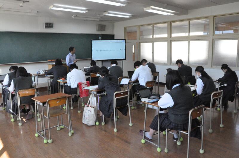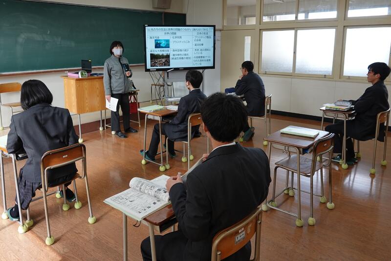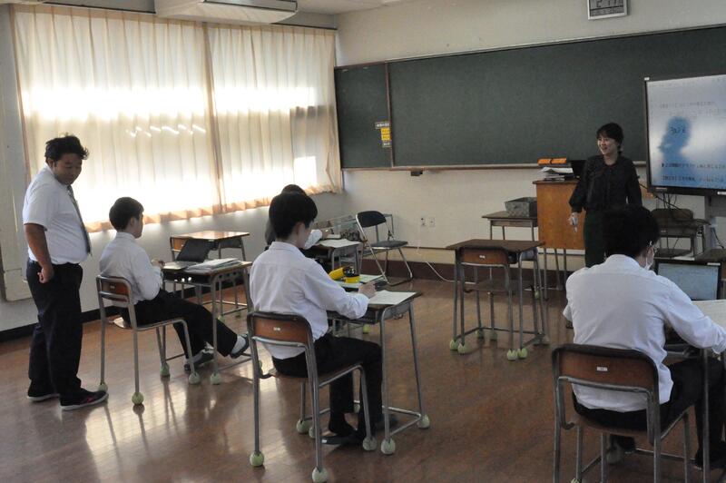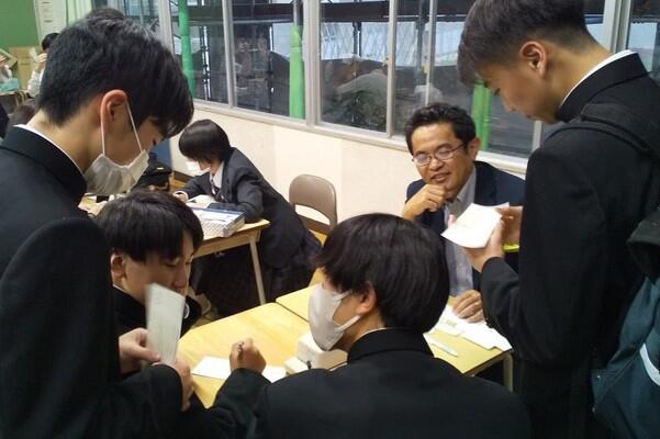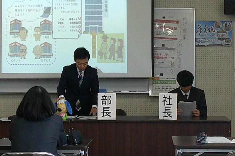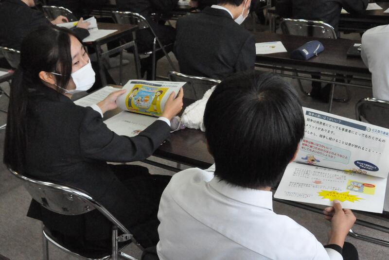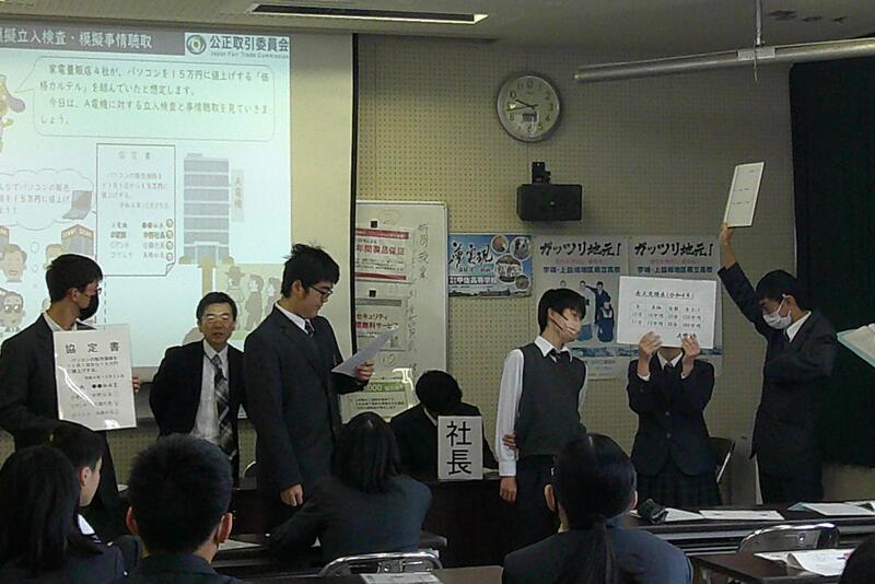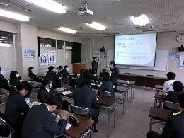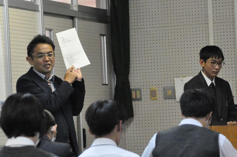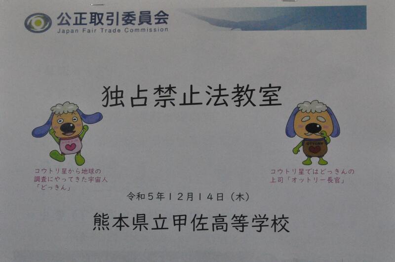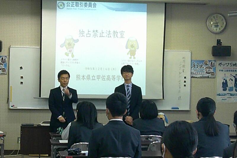 県内の高校では本校だけの取組で、公民科(公共・政治・経済)の1年生および3年生選択者が法や機関について学びました。本日1限目、公正取引委員会事務局九州事務所より、幸屋・森様に来校していただき、「独占禁止法」について講演をしていただきました。また、生徒達が市場競争や立入検査のロールプレイも実施し、公正な社会の在り方を考えることができました。