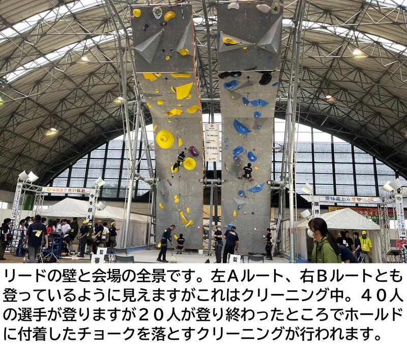 次は2日目、リード競技の様子です。リードは制限時間6分で到達高度(どこまで登れるか=どこで落ちたか)で競います。