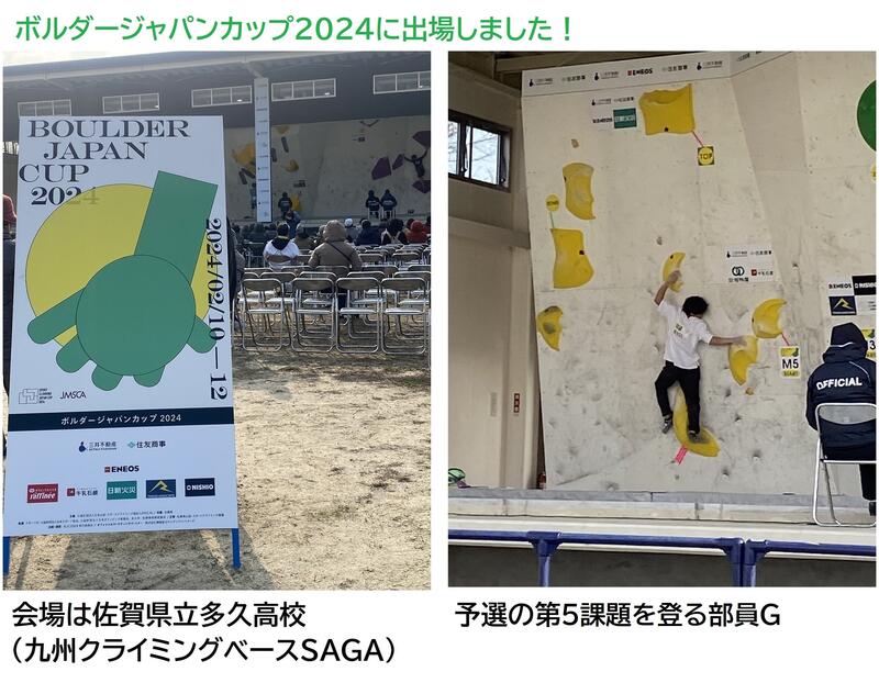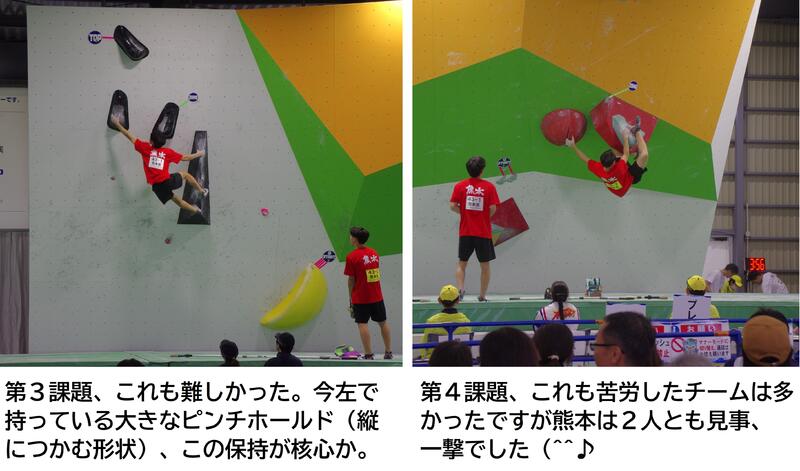 本日、10月8日(日)ボルダリング予選が15時頃から開催されました。地区予選を勝ち抜いた各都道府県代表20チーム(2人1組)が予選に挑戦しました。熊本県代表は12番目の挑戦でした。2人でコースを話し合い、2人の到達した得点の合計、チャレンジ回数などで順位がつけられ、全体で10位でした。8位までが決勝進出のため、残念ながら予選敗退となりました。明日は、リードの予選が行われます。決勝に残れるように応援しましょう。”ガンバ!”