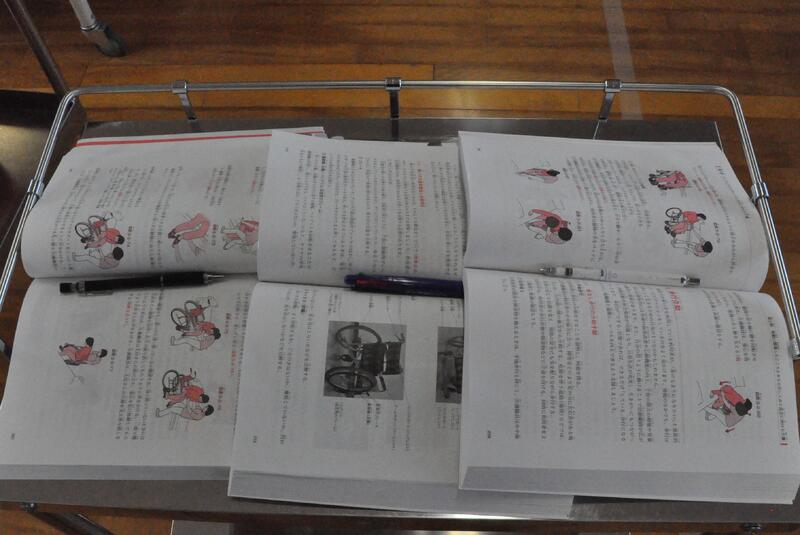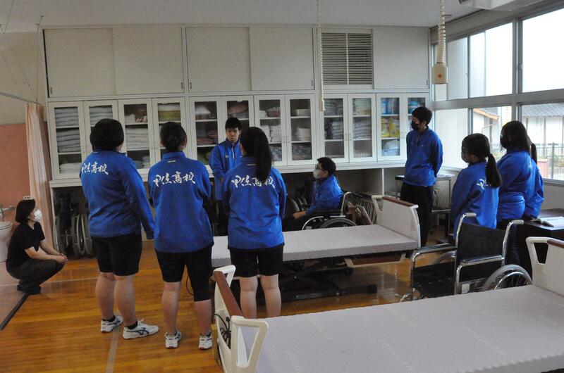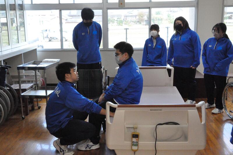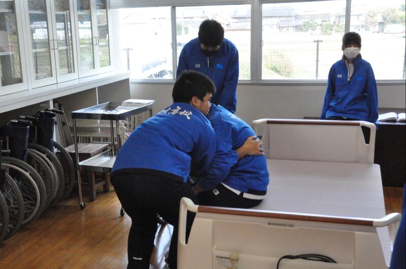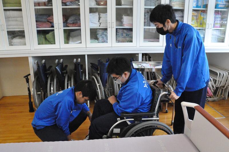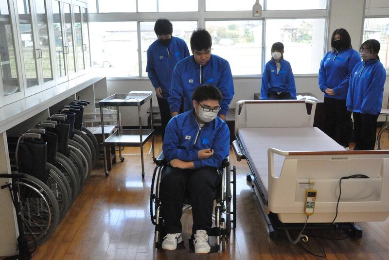3年生普通科福祉コースの授業の様子です。車いすを利用した介護・移動の実習です。