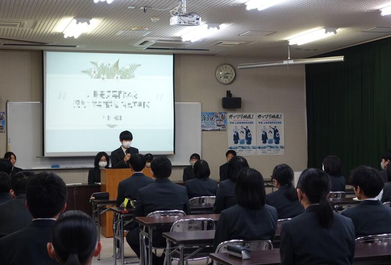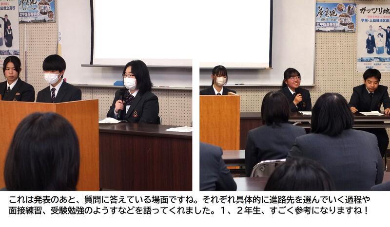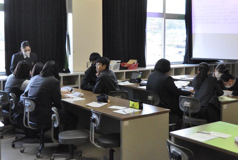 12月7日(木)3,4限目の時間で、3年普通科教養コースと福祉コースの課題研究発表会を行いました。自分で研究テーマを決め調べる中で、課題への解決はもちろん、今後の生活にこの学び方を活かそうというものです。地域の方にもアンケートに答えていただいたり、お話を聞かせていただいたりと、たくさんご協力いただきました。ありがとうございました。3年生の発表に対して、2年生からの質問とそれに対する回答など、卒業後の進路に繋がる内容もあり、短い時間でしたが充実したまとめとなりました。