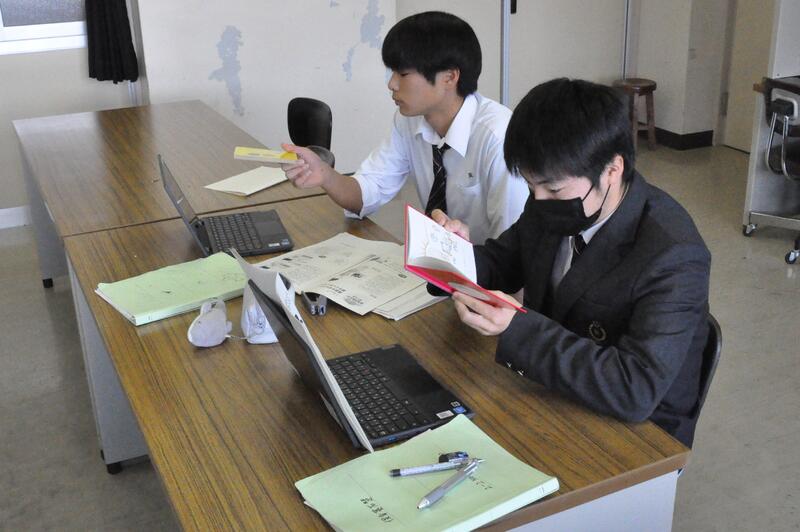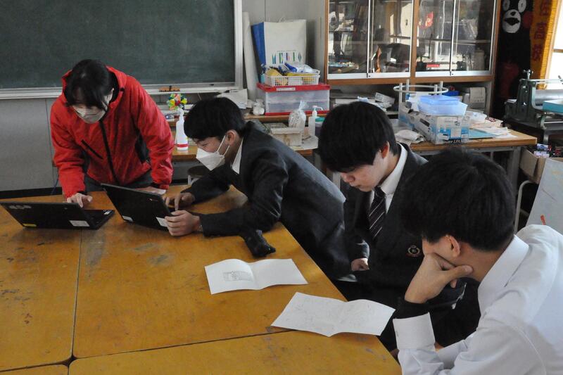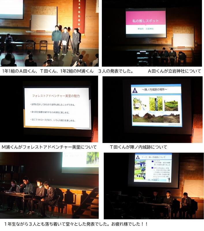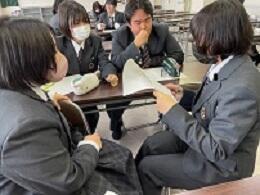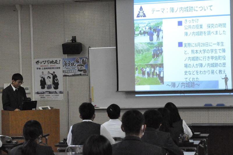 1年生における探究活動は、甲佐町にある陣ノ内城跡をめぐり、歴史や背景等について調べ学んだことをまとめ、地域活性化のために役立つ提案を話し合っています。