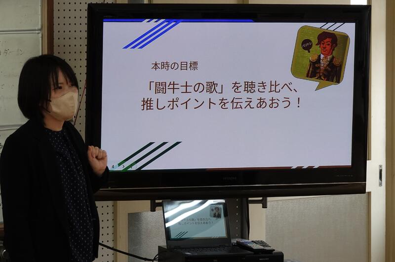 生徒の感想を一部紹介します。「Bの方はAよりも舌を巻いて歌っていて、いいなと感じました。」「闘牛士の歌は聴いたことがあって、でも歌う人によって表現の仕方が違うので、聴いていて楽しかったです。」
