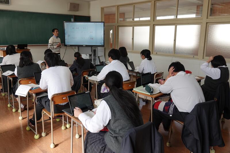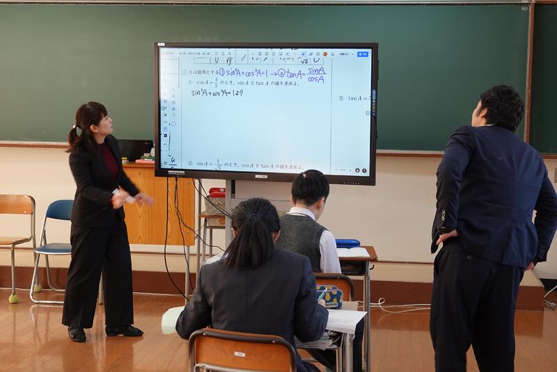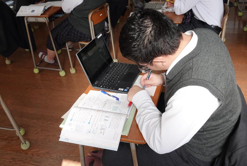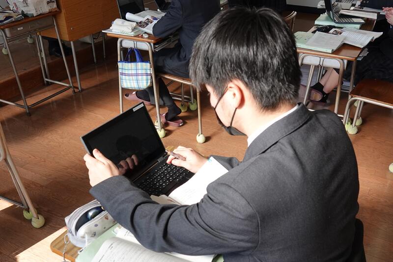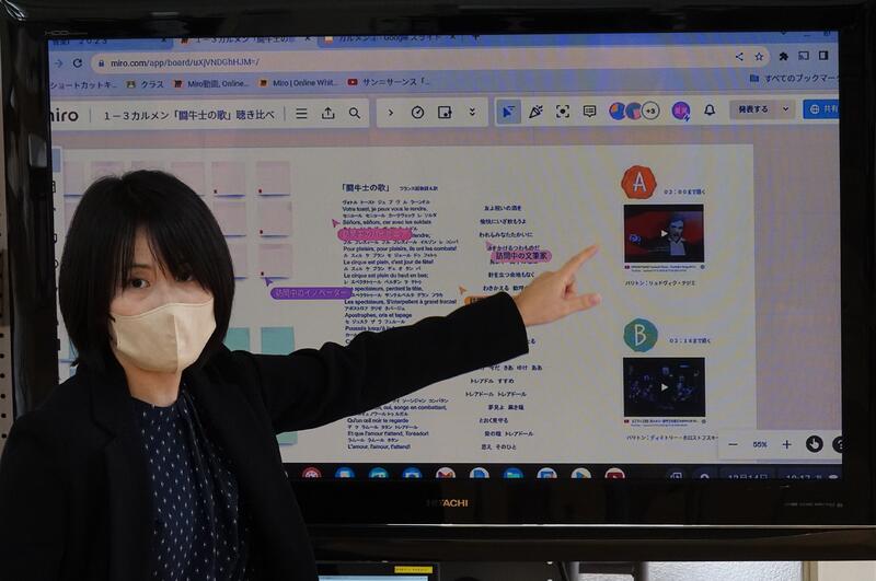 有名な「闘牛士の歌」を比較聴取し、表現の違いを発見するという授業です。Miroを活用し、何度も繰り返し音楽を聴きながら、付箋に気付いたことを入力していました。生徒たちはしっかり集中して授業を受け、積極的に意見を出していました。