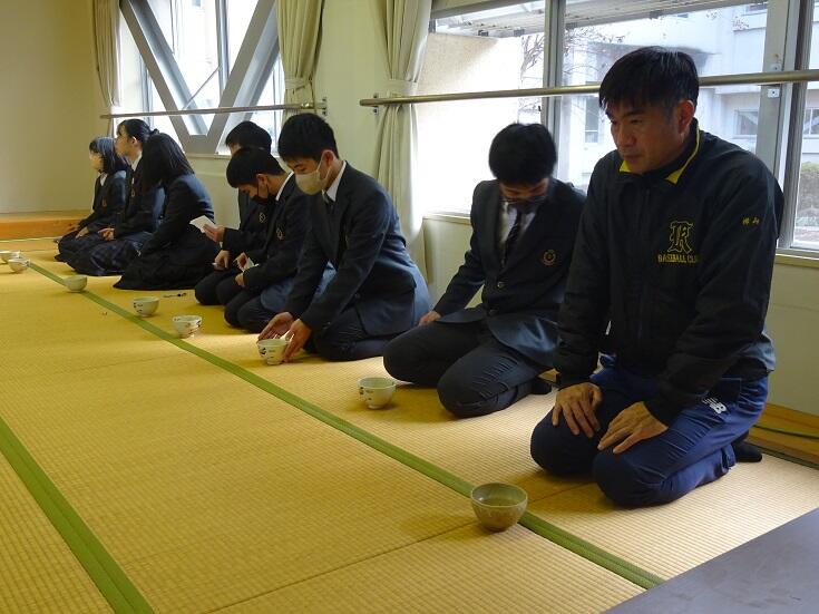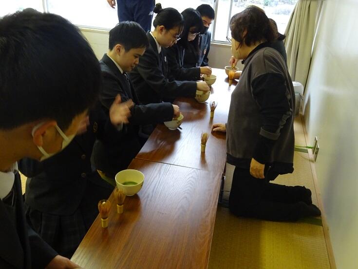 まず福祉科N先生のお点前を見て、自分たちでお茶を点て、お茶の作法に従って飲む体験をしました。