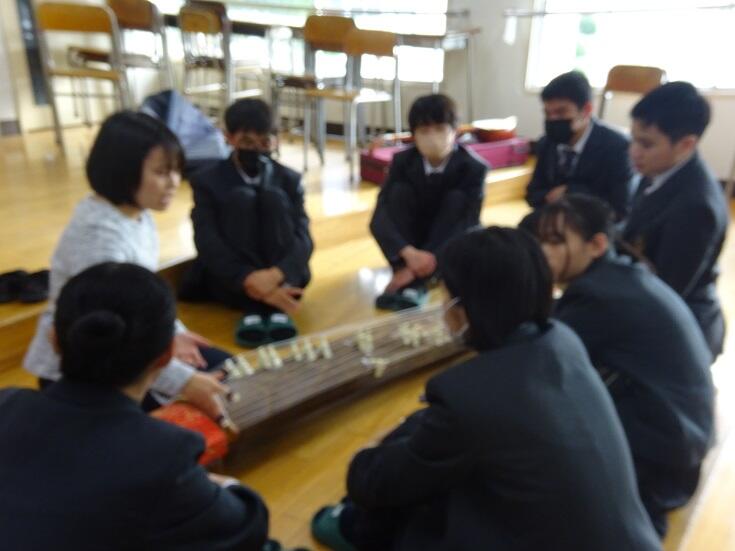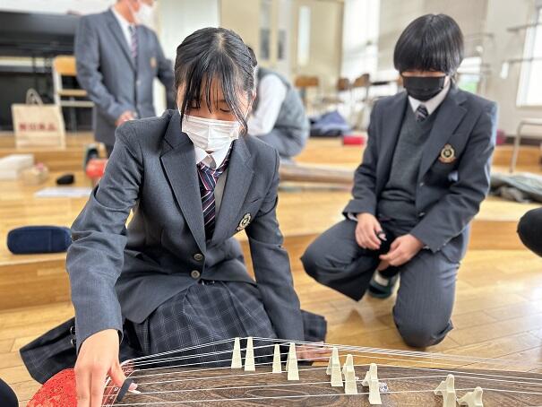 琴グループは「さくら」を演奏しました。中には初めて箏に触れる生徒もいましたが、短時間で集中して取り組むとすぐに弾けるようになり素晴らしかったです。合わせ爪などの技法にチャレンジする生徒もいました。