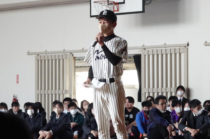 まず生徒会によるテーマ発表。顧問の先生たちも一緒に「ヤングマン」の曲に合わせて「Y!M!K!A!」と踊ります。「C」ではなく「K」で、今年のテーマ「やりがいもって」「みんなで目指せ」「輝く」「熱甲!!」が発表されました。全校生徒で「熱甲!!」とポーズを決めました。例年とは少々違う斬新なテーマと発表の仕方に、みなさんちょっと面食らいぎみでした(笑)。