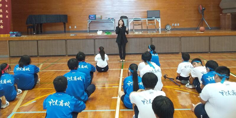 10月17日(火)午後、スポーツフェスティバル~紅葉の陣~のバスケットの練習を行いました。開始前に、県議会議員杉嶌ミカ様から生徒に「夢をあきらめない、夢をかなえる」勇気を頂く話をしていただきました。杉嶌様(singer song writer MICA さん)には、本校文化祭でコンサートを依頼していましたが、公務と重なり文化祭への参加ができないため、生徒の激励のため来校されました。お話を聞いて、生徒も大変喜んでいました。また、同期の県議会議員斎藤陽子様にもおいでいただき、生徒の様子を見ていただきました。