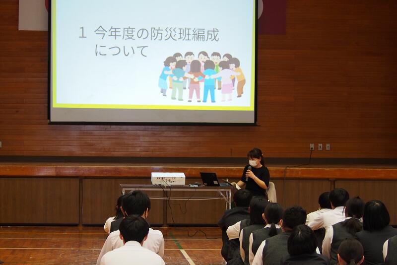 本日、6限終了後にクラスでの避難経路確認と避難訓練後に防災班編成等について、防災主任から説明を行いました。生徒諸君は話もせず、安全に体育館へ避難し、防災時に関する対応等をしっかり聞いていました。