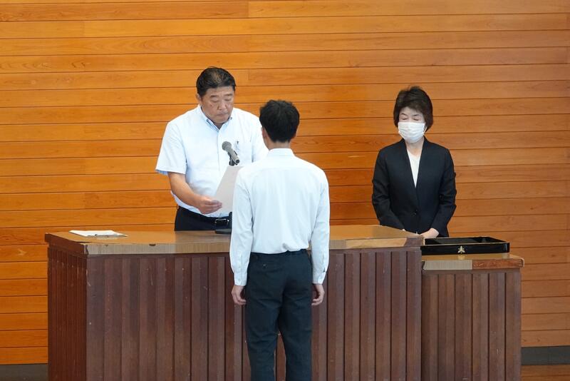 7月23日(火)、本校ALTカーソン先生の退任式と5月以降本校で勤務いただいている先生方の新任式、表彰式(3年西村さん:高文連春季写真コンテスト入選、2年森本さん:バドミントン体育堂サマーカップ女子4部シングルス3位、2年後藤君:第78回国民スポーツ大会スポーツクライミング競技熊本県選考会少年男子1位)と夏季休業前の全校集会を開きました。