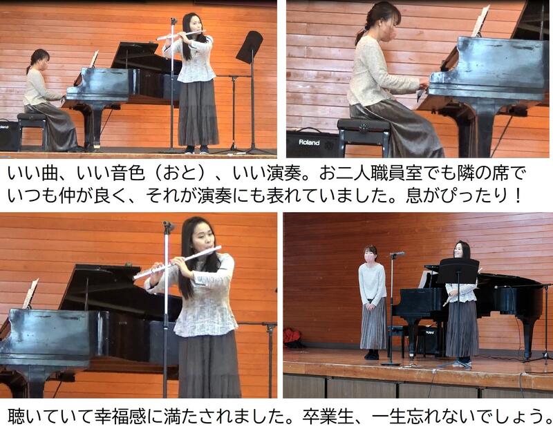 次にステージでは音楽のH川先生のフルート演奏。伴奏は国語科のO野先生。曲は映画「塔の上のラプンツェル」より「輝く未来」。この映画は塔の上に閉じ込められていた女の子ラプンツェルが18歳の時、ユージーンという男性と出会って旅に出るお話で、これから新しい世界に旅立つ同じ18歳のみんなに贈るのにピッタリと思って選びました、というH川先生の曲紹介のあと演奏が始まりました。