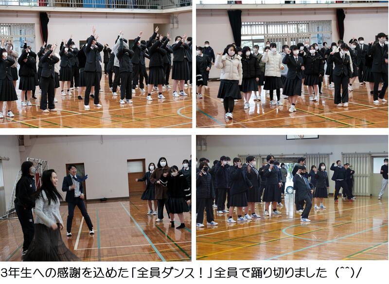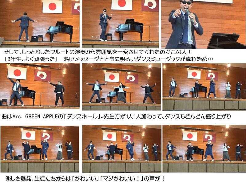 今回の企画の内容は3年生には詳しくは知らされておらず、ほとんどサプライズでした。サプライズの連続、サプライズの波状攻撃。とくにこのフルート演奏からダンスへの流れは、3年生意表を突かれてびっくりして何が何だか分からないくらい感動して、泣いている子もたくさんいました、ほんとうに。