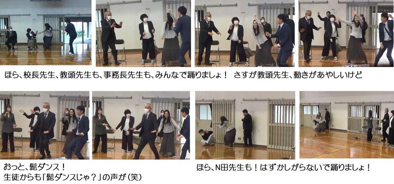 そしてステージからフロアへ先生方が駆け下りて、校長先生を踊りに誘います、教頭先生、事務長先生、生徒指導主事のN田先生、すべての先生方・・・