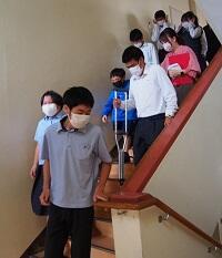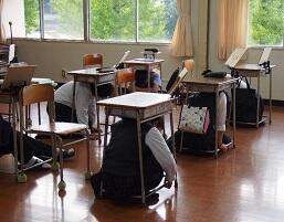 放送で地震の音源を流すと、生徒たちは身を守る行動をとります。