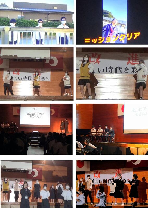 甲佐高生が2人、テレビを見てます。ザッピングっていうんですか、チャンネルを次々変えて。するといろんな番組が放映されているのですが、それが「逃(暴)走中」、「クイズ番組の〇大王」、「歌番組、ダンス」。それらの番組を映像やステージ上でやって見せるという、ジャンルでいえば劇中劇みたいなものでしょうか?いやあ凝ってました。やりますね、さすが中核学年の2年生でした!
