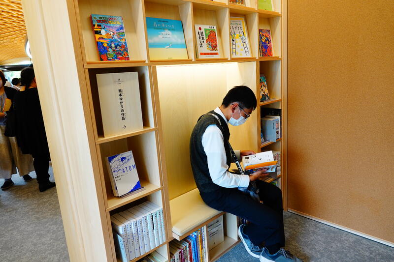 ‘こども本の森 熊本’は4月にオープンしたばかりで、木の香りが漂っており、天の川の飾りが目に涼しく、とても心地よい空間でした。