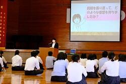 11月14日(金)にNPO法人DV対策・予防センター九州理事長 原 健一 様をお招きし、『お互いを大切にして、よりよい関係を築くために~交際相手からの暴力“デートDV”について~』と題して、講演会実施しました。感想文に『お互いを尊重することが大切だと学んだ。男女関係だけでなく、友達関係でも同じことが言えるので、日頃から言葉遣いに気を付けたい』『暴力ではなく、話し合いで解決したいと思った』等あり、学びの多い研修になりました。