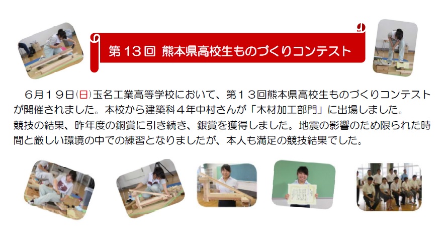 平成24年6月に開催された「第9回 熊本県高校生ものづくりコンテスト」において、古場隆行君(当時建築科4年生)が、常勝の球磨工業高校を破り、見事優勝(金賞)し九州大会出場を決めました。九州大会は1ヶ月後の7月に大分市で開催され、古場君はおおいに健闘しましたが惜しくも2位となり、全国大会への切符は手にすることができませんでした。応援してくださった皆様ありがとうございました。