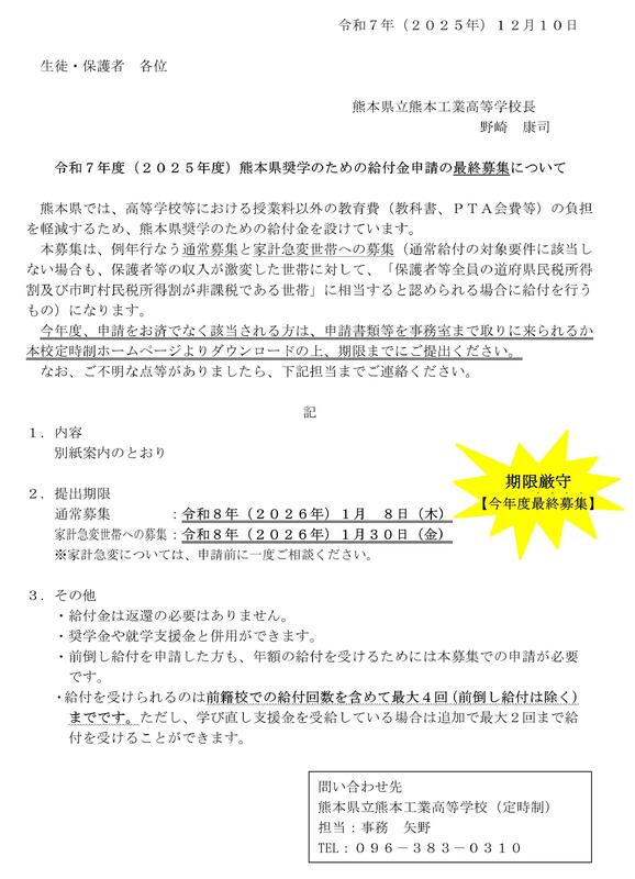 会議・研修 令和7年度(2025)熊本県奨学のための給付金申請の最終募集について