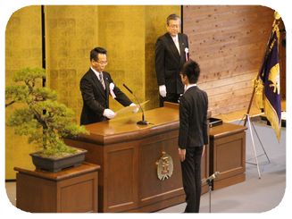 3学期の始業式の後、成人者には校長室で記念品贈呈式がおこなわれ、校長先生から記念品の
