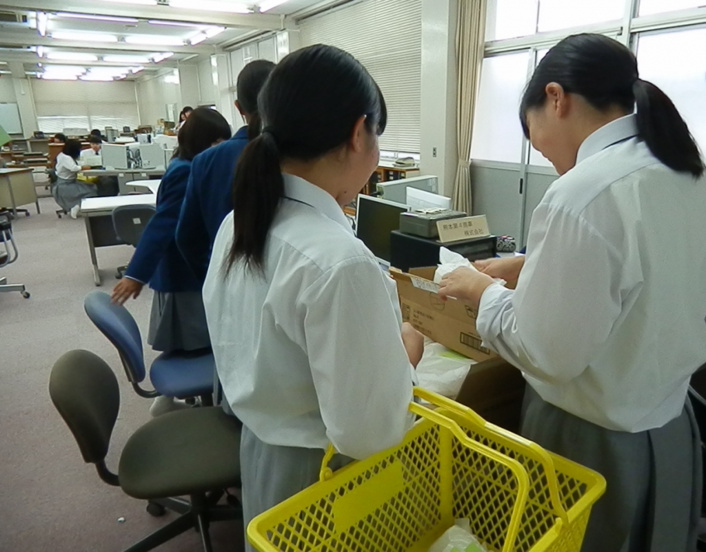 店長・課長会議の様子です。総務課の生徒がレジ袋の仕分け作業を行っています。明日からいよいよ球商百貨店に向けた準備も始まります。残り少ない期間で商品知識を付け、来場された方に満足してもらえるよう良い接客をしましょう。頑張れ球商生!!