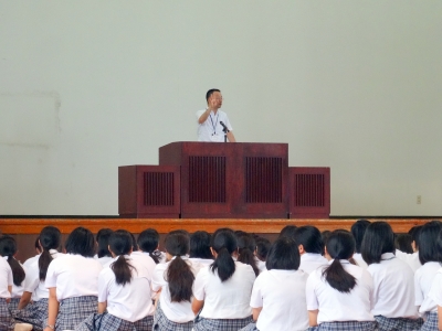 校長式辞では、1学期間の生徒の部活動や競技会での活躍に触れ、
