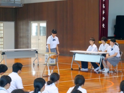 各クラスからの代表者が、志望の動機や学校生活での思い出について質問され、
