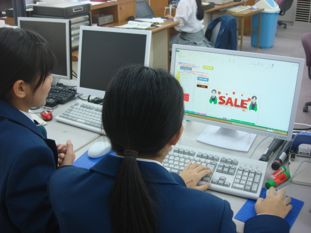 これは、販売課の準備の様子です。各店舗仕入れる商品が決まったら値札作成とPOP広告作成を行います。一人ひとりがしっかり商品知識をつけ接客出来るよう、練習していきましょう。