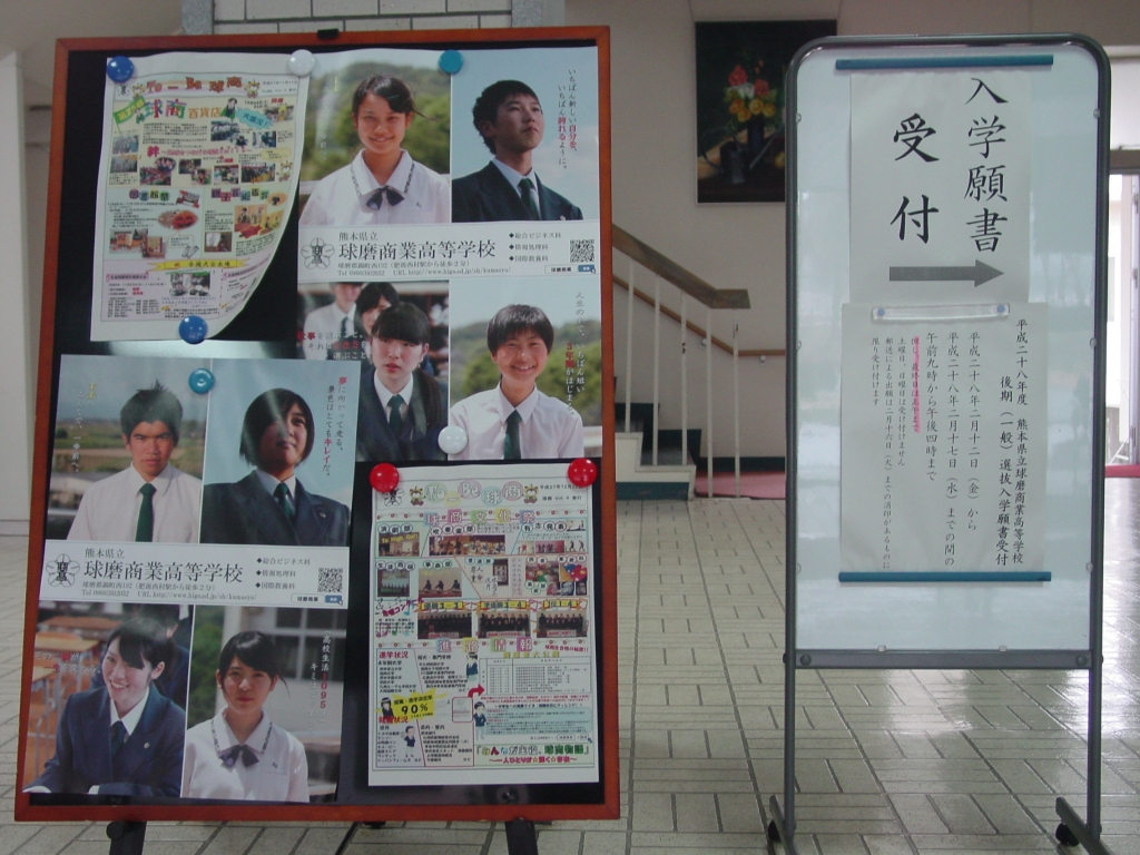 本日(平成28年2月12日)より、後期(一般)選抜試験の受付が開始された。いよいよ決断の時が到来した。本校で「君の夢実現へ向けて飛翔!」先輩や先生方、君の入学を記念しています。「来たれ 球商へ」