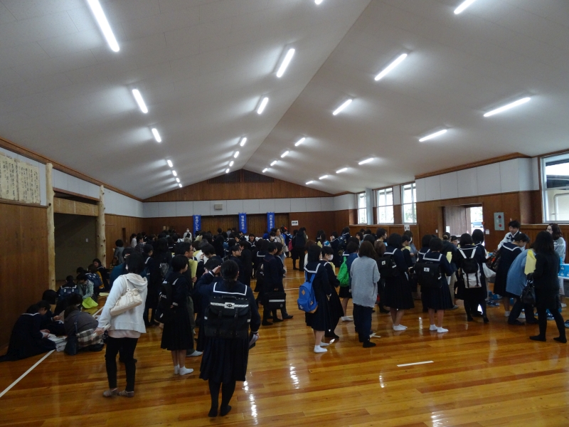 午後の体育館では、合格者説明会が行われました。入学時に必要な書類や高校での学習や生活態度などについて各科から話しがありました。その後、教科書、スリッパ、電卓の販売が行われ、新しい教科書や電卓を手に笑顔がたくさんの新一年生の様子がみられました。