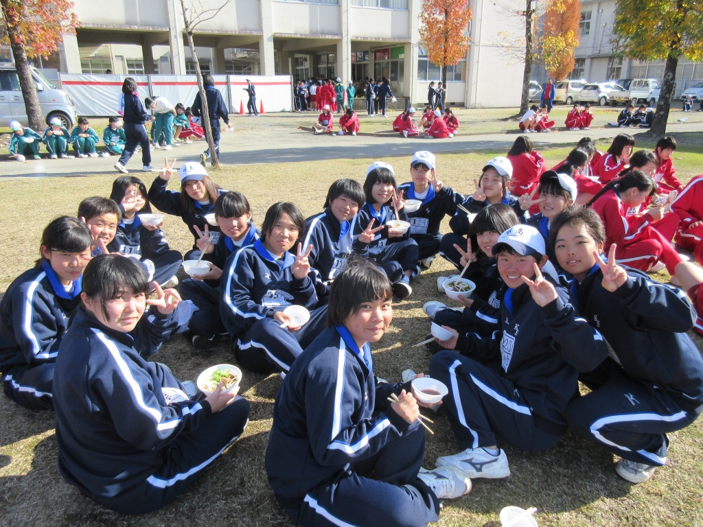 12月16日に校内長距離走大会が行われました。男子は12km、女子は10kmのコースを寒い中、懸命に走っている姿が見受けられました。クラスマッチ形式で表彰されるため、クラスの団結が深まり、すがすがしい表情を見せてくれました。走り終わったあとは育友会から、うどんとおしるこが提供されました。冷え切った体も温まり、みんな笑顔で何杯もおかわりする生徒もおり、大満足の様子でした。協力していただいた保護者の皆様、ありがとうございました。