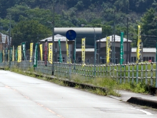 この時期になると、学校前の直線道路に「のぼり旗」がたてられます。