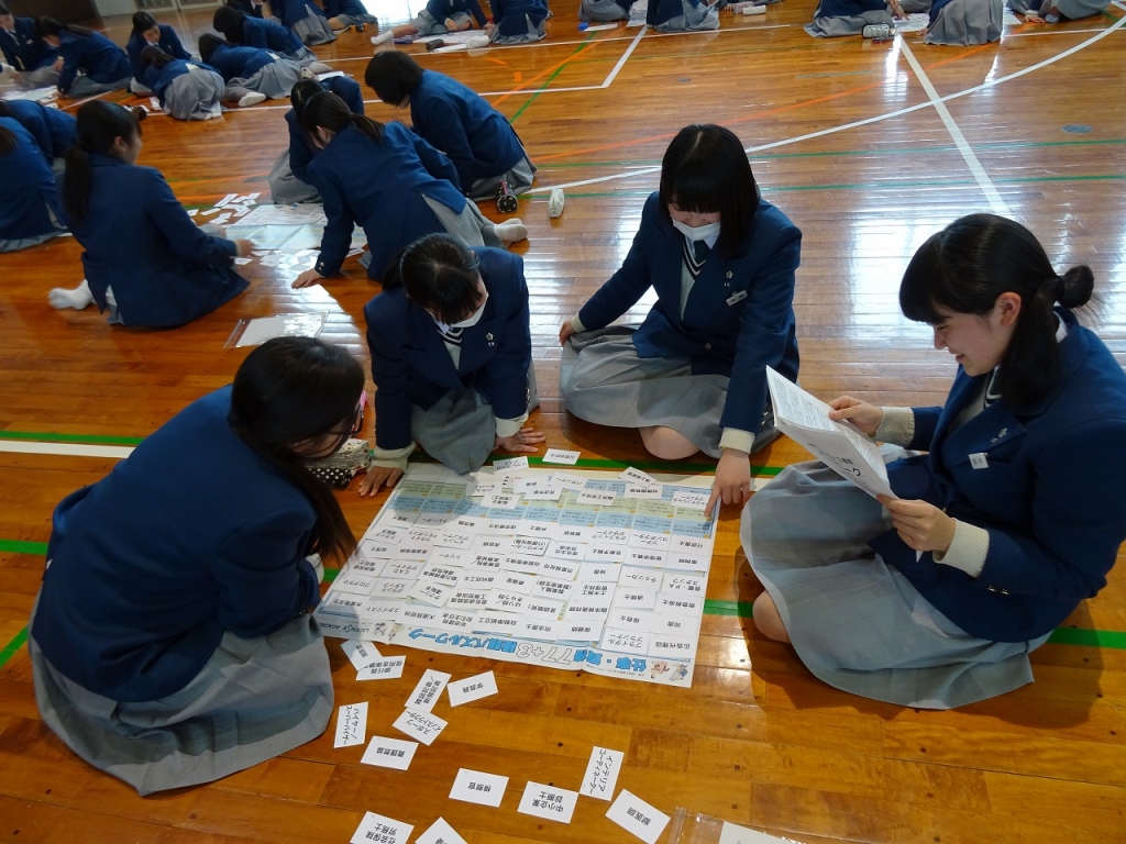 1年生を対象とした進路説明会がありました。仕事内容を見て、77種の職種からどの職業に該当するのかを考えている様子です。グループに分かれ、意見を出し合いながら作業をしていました。今後の自分の進路を決める良い参考となりました。