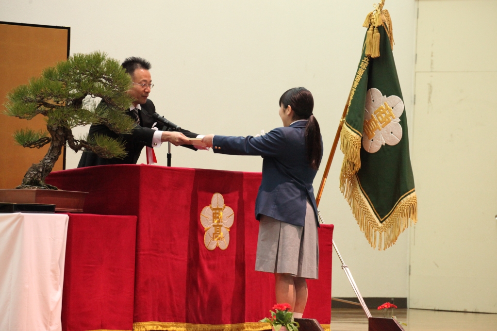 本日、卒業式が挙行されました。担任の先生から一人ずつ名前を呼ばれ、クラス代表の生徒が校長先生から卒業証書をいただきました。