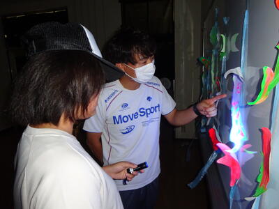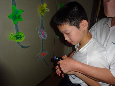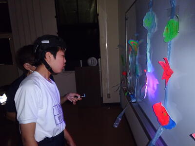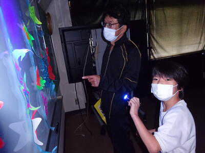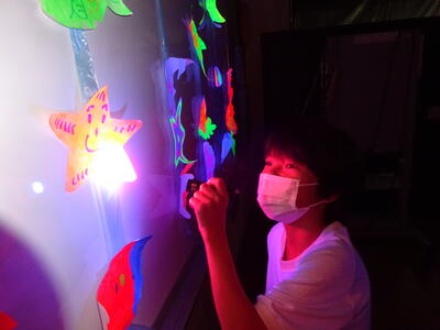 何日も前から蛍光絵の具とクレヨンを組み合わせて1匹1匹丁寧に描いてくれました。光が入り込まないように窓やドアをカーテンで覆って部屋の中は真っ暗です。入室者はペンライトを使って進んでいきます。ペンライトに照らし出された魚たちは今にも泳ぎだしそうです。