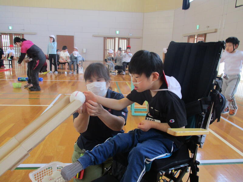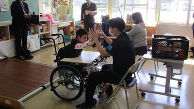 10月26日(水)に熊本県教育委員会特別教育支援課による学校訪問が行われました。校長室で本校の取り組みを説明した後、授業中の子供たちの様子をご覧いただきました。子供たちは初めてのお客様に驚きながらもいつものようにニコニコと元気よく活動してくれました。小学部・にじいろ学級の「自立活動」の授業では、一人一人の興味に応じて準備した教材を教師が一つずつ提示していきました。対象の児童はそれらをよく見て手を伸ばし、筒から抜いたり箱から取り出したりするなど、手指の動きを高める学習に時間いっぱい取り組むことが出来ました。課題をクリアする度に児童は笑顔を浮かべ、教師も「できたね! やったね!」と喜びを分かち合う姿がありました。