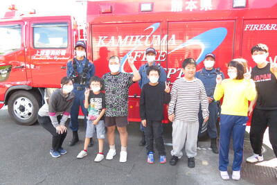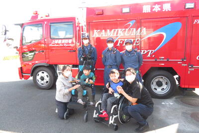 上球磨消防署から3名の隊員に来ていただきました。キリリとした表情や隊長の指揮でテキパキと動かれる姿に子供たちは羨望のまなざしを向けていました。消防車の前で記念撮影もしていただきました。ワクワクドキドキの子供たちの笑顔がとても印象的でした。
