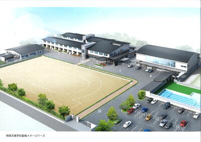 【校舎移転について】球磨支援学校は令和6年度中に現在の場所(球磨郡公立多良木病院裏)から多良木高校跡地へと移転します。写真は完成予想図です。新設の校舎や1周150メートルのグラウンド、そして25メートルのプールが完備され、敷地も広くなります。教室の数も増え、これまでなかった図書館や特別教室が整備され、子供たちの新しい発見や取組みに繋がると思います。校舎内には空調施設も整備されており、集中できる学習環境となっています。また、体育館も新しくなり、安全面に配慮された作りで思い切り活動ができます。これまで、多良木高校には素晴らしい歴史と伝統がありました。地域の方からとても愛された素晴らしい学校でした。その跡地に移転できる喜びを噛みしめながら、多良木高校のように地域に愛される学校を目指します。