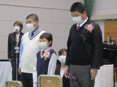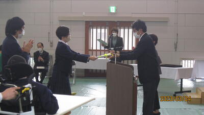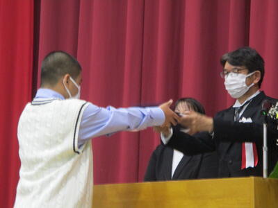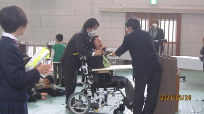 3月24日(金)に令和4年度の修了式を行いました。今年度初めて、全学部が体育館に集合し行事を開催できました。各学部、各学年の代表者に修了証を手渡し、1年間の頑張りを全校生徒で讃えました。今年度は新型コロナ感染症の影響で昨年まで開催出来なかった修学旅行をはじめとした学校行事も形を変えながら可能な限り行うことが出来ました。今だからこそ出来ることに一生懸命に取組んだ子供たちの頑張りとそれを支えていただいた保護者の皆様に心から感謝いたします。地域の方々、関係機関の方々、そして保護者の皆様、令和5年度も球磨支援学校への御理解、御協力の程、よろしくお願いいたします。
