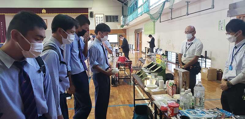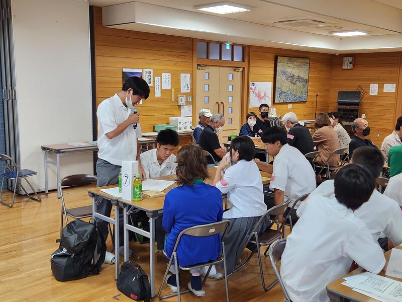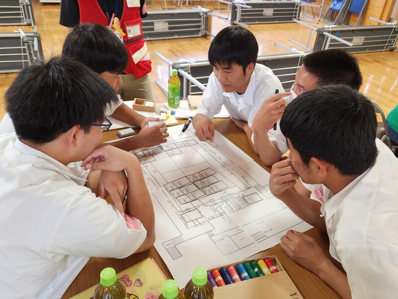 まず、開会後に自己紹介を兼ねたアイスブレイクとして、「避難するときに1つだけ持って行けるとしたら何を持って行く?」という問いに対してグループワークがありました。本校の生徒の大半はやはり「スマートフォン」という答えでしたが、「簡易トイレ」や「母子健康手帳」と答える生徒もいました。(発表の際には会場がどよめきました。)