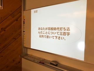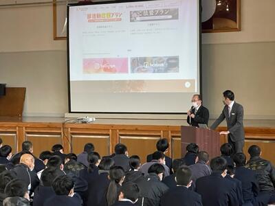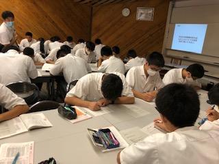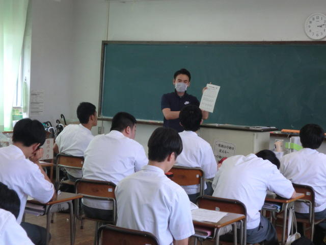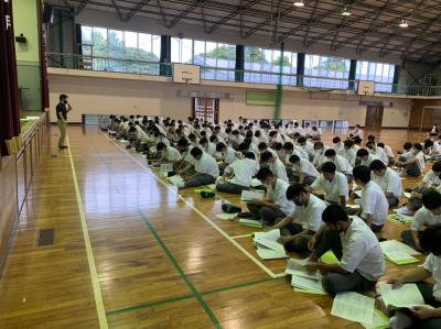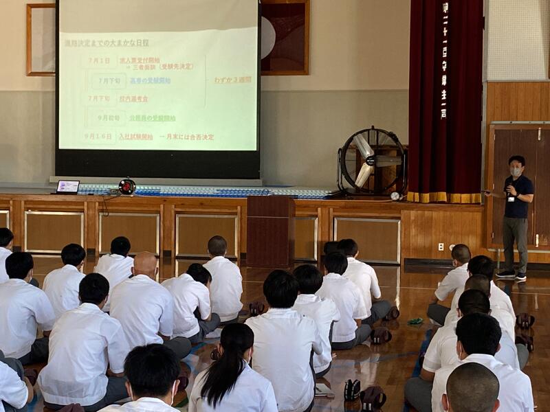 進路ガイダンスにおいて進学希望者は大会議室にて「少しのことにも先達はあらまほしきことなり~先輩の話を聞いて進路意識を高めよう~」と題し、ガイダンスを行いました。今年卒業したばかりの二人が自身の経験談や進学に向けたアドバイスを語り、1,2年生はその話に聞き入っている様子でした。二人とも本当にありがとう!後輩たちも次に続いてくれるはずです!
