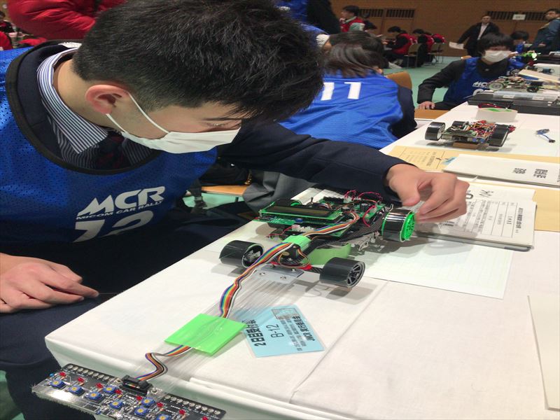 11月23日(土)、24日(日)に大分工業高校で行われたジャパンマイコンカーラリー2025九州地区大会へ3MA湯本くん、3MB助廣くん(2台)が出場してきました。大会1日目はフリー予選走行、2日目は予選走行が行われました。出場した2台とも、学校でのコースではしっかりと走ってくれましたが、本番は完走率が悪く、結果として予選敗退となってしまいました。機械科の課題研究として車体製作、プログラム調整を行ってきましたが、全国大会への出場権は獲得できませんでした。残りの課題研究の授業で、もう一度マシンを見直したいと思います。