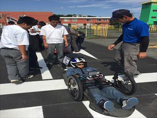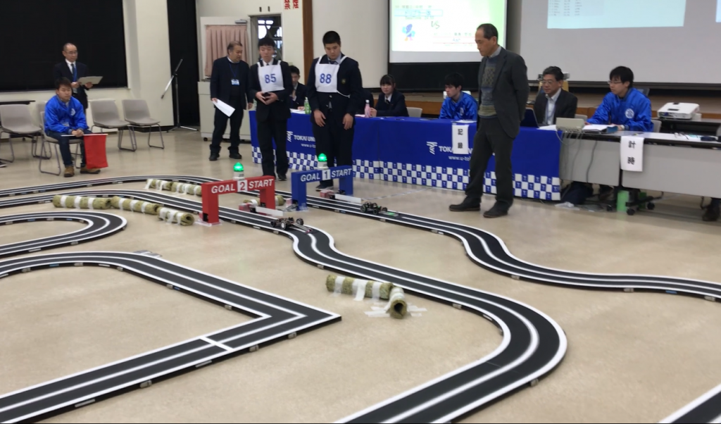 ①鉛電池部門・・・支給された12Vバッテリーを用いて、自動車学校の外周コース(約400m)を
